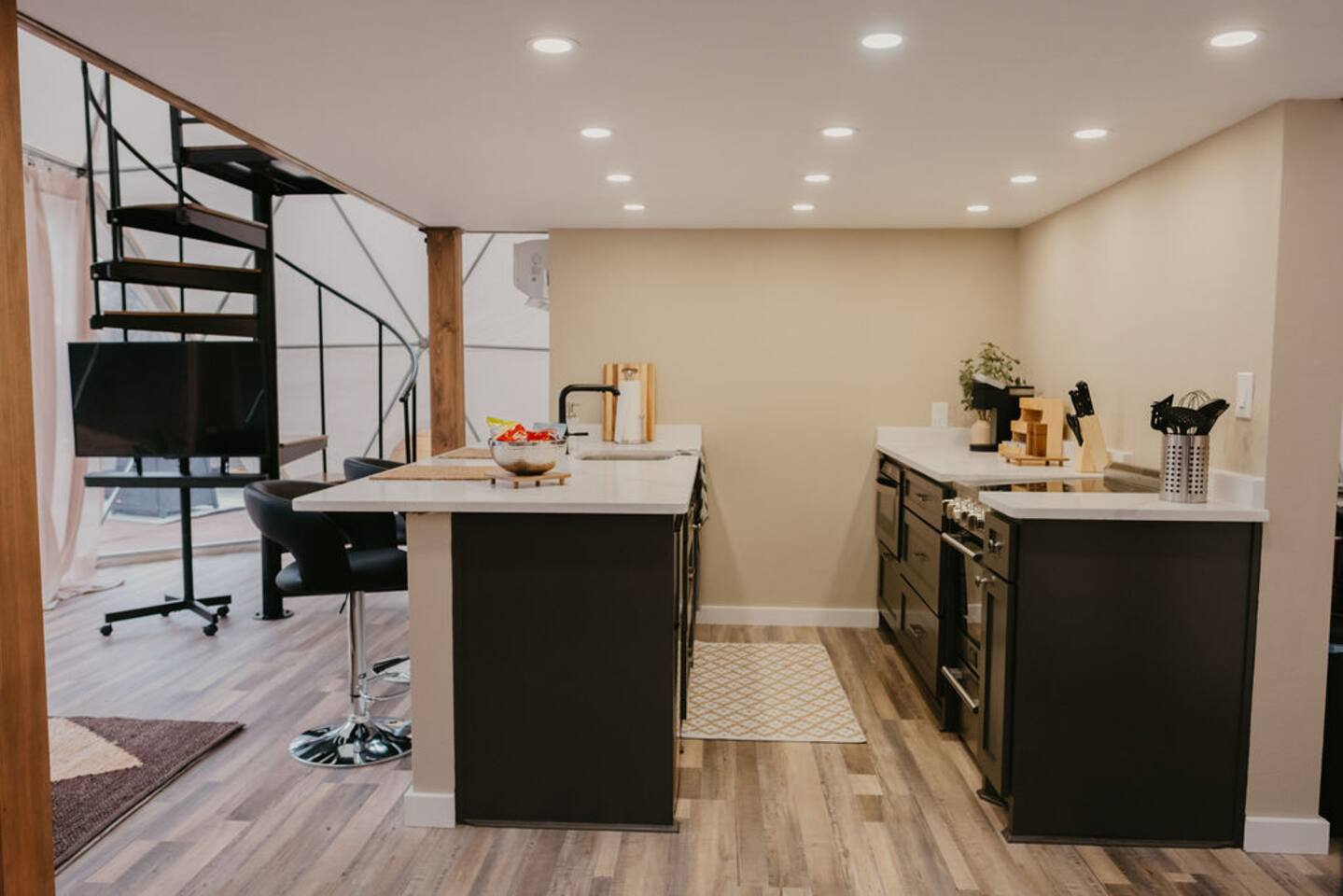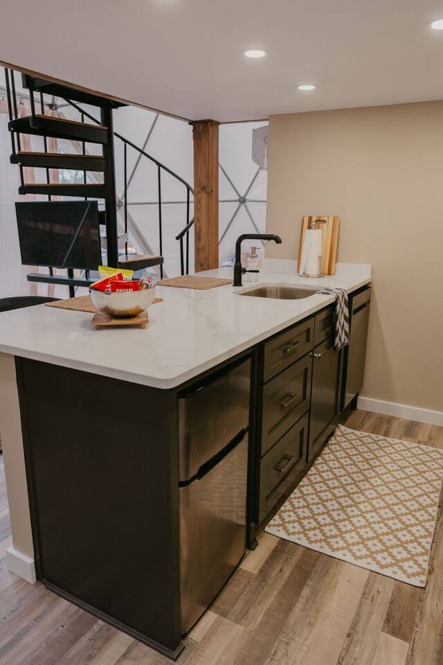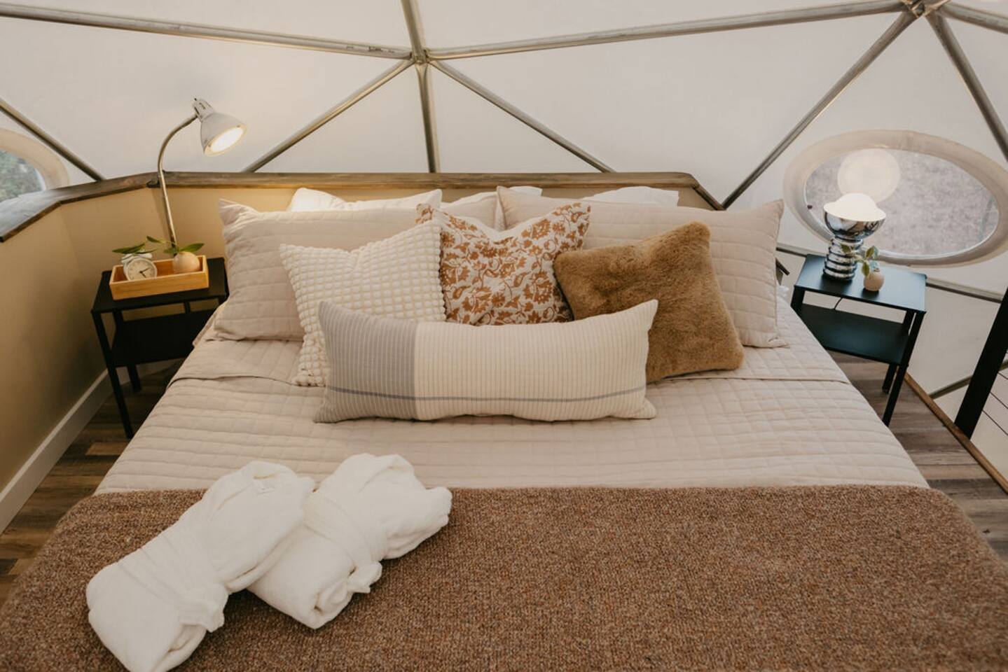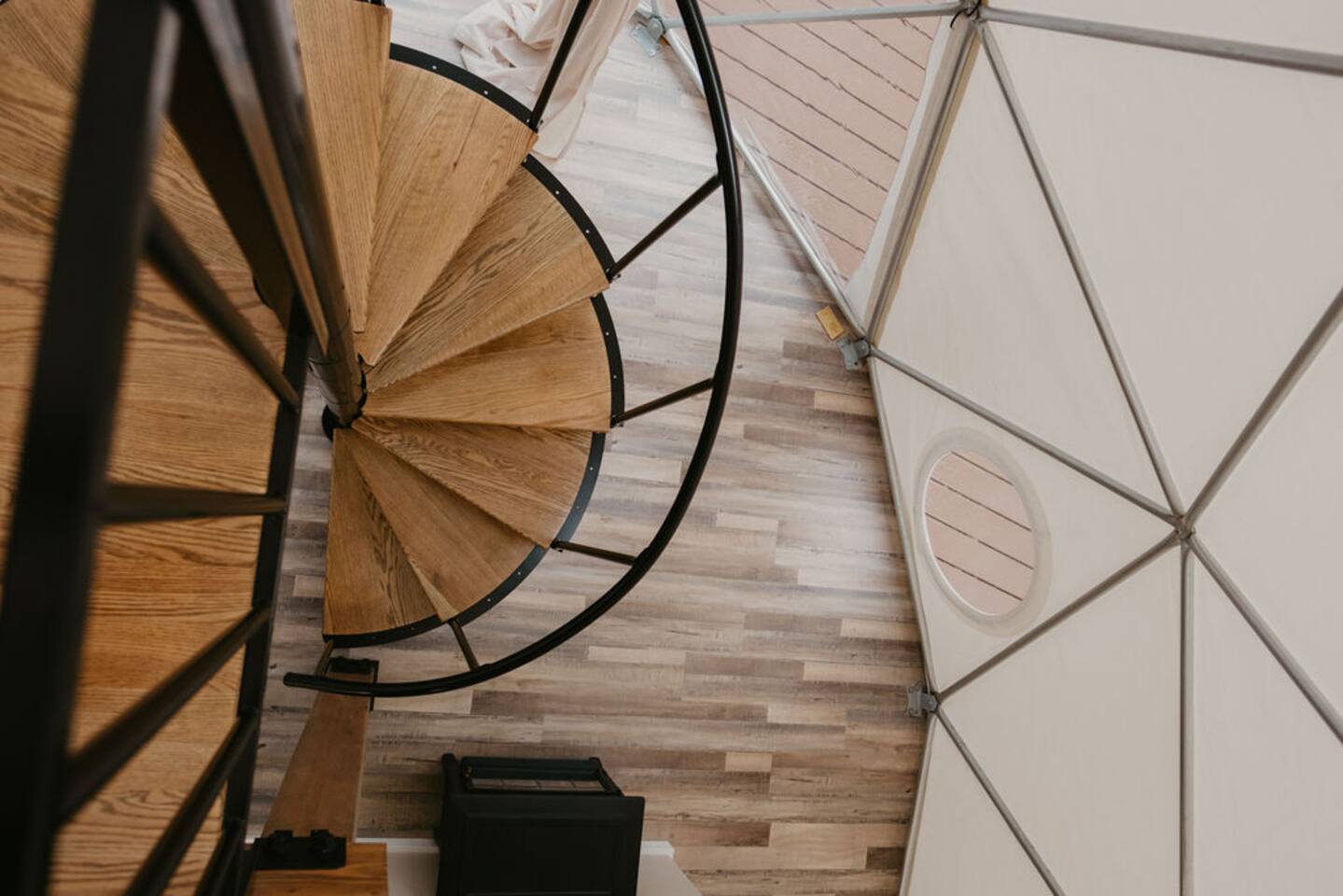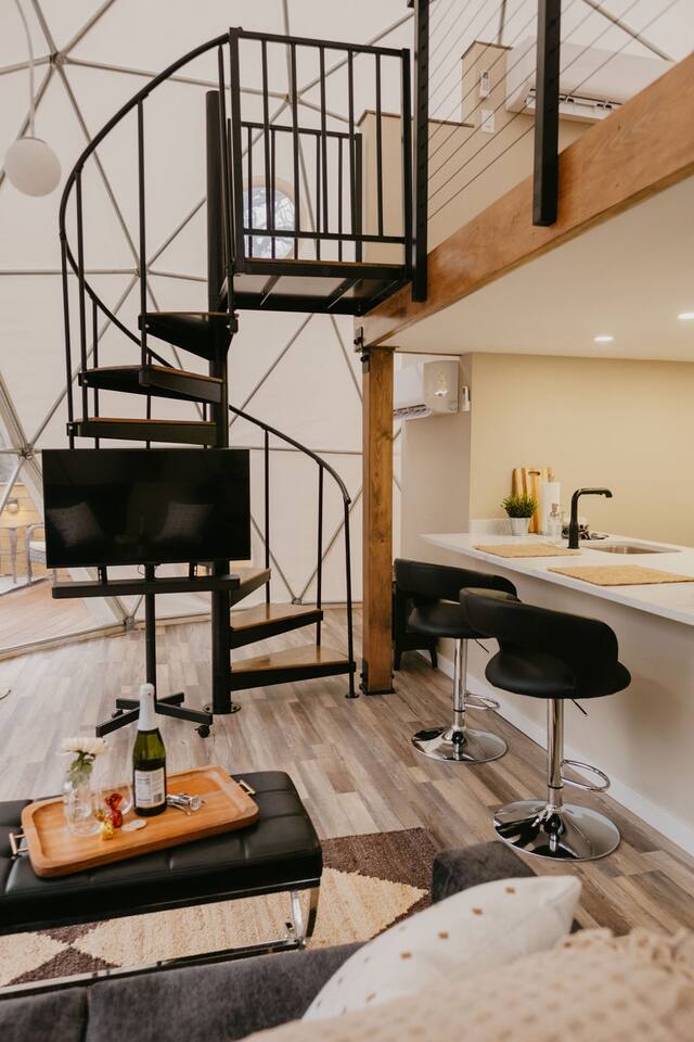 Enjoy this secluded and romantic spot in the oaks. Whether honeymooning, babymooning, celebrating an anniversary, or just needing a break from the busyness of life, the LoftDome luxury dome will provide the perfect place to reconnect, renew and rejuvenate. The central spiral staircase leads to a heavenly king-size bed! This air conditioned experience with an outdoor shower and hot tub takes glamping to a whole new level. (If your dates are already booked, check out our SkyDome.)