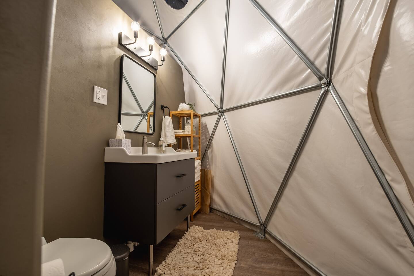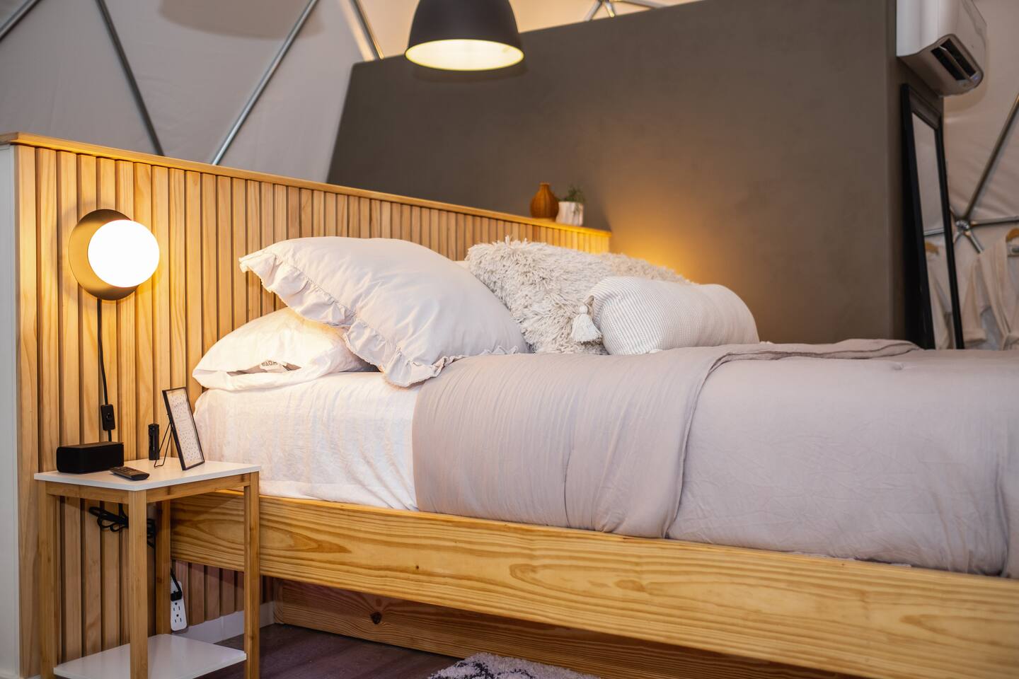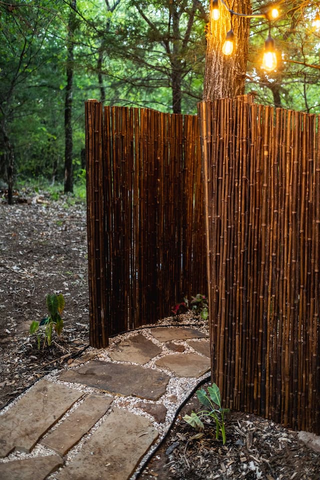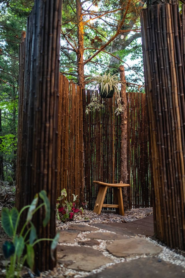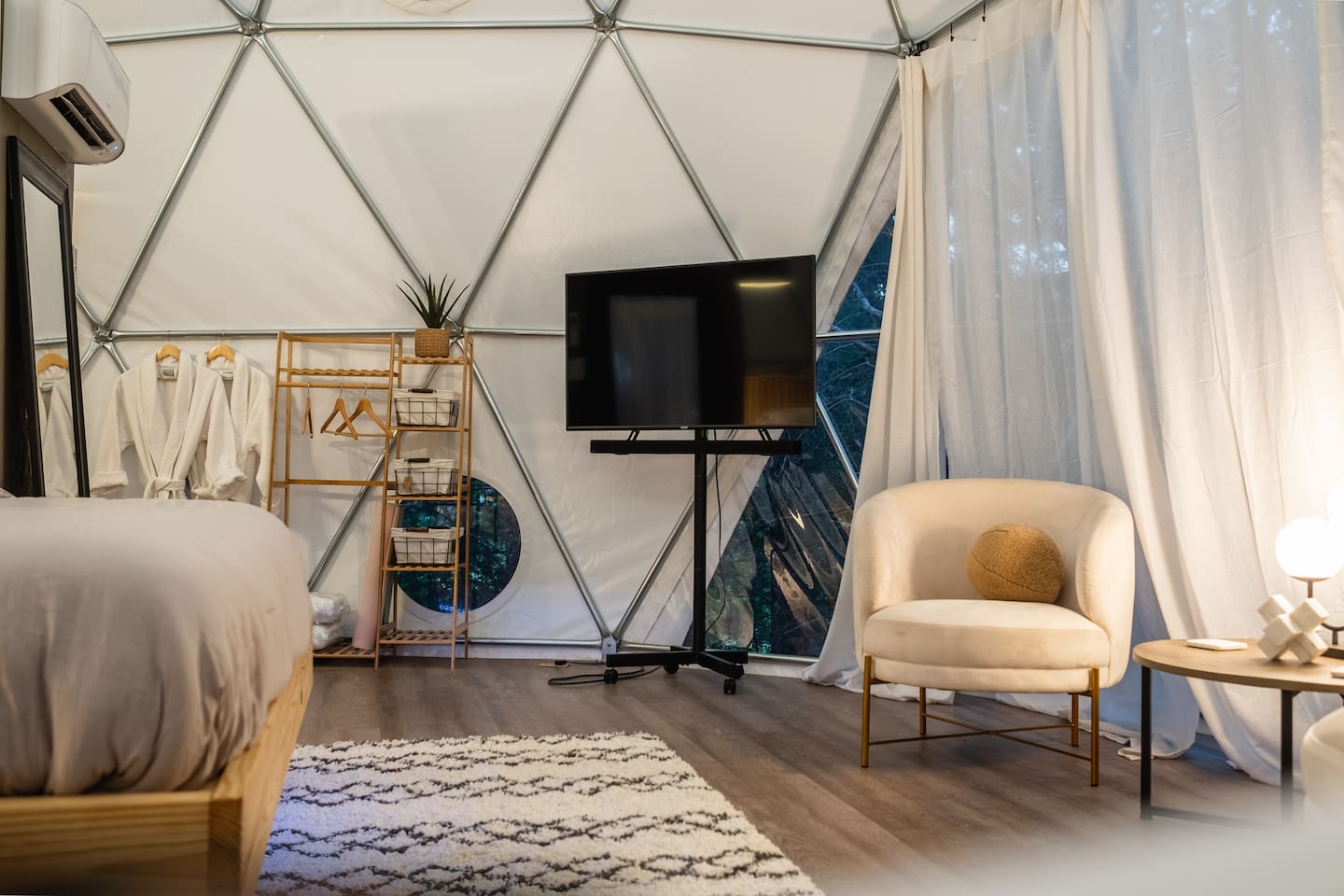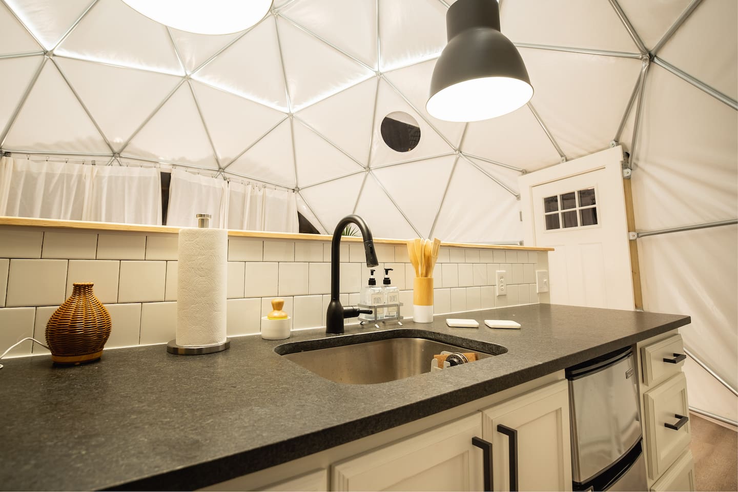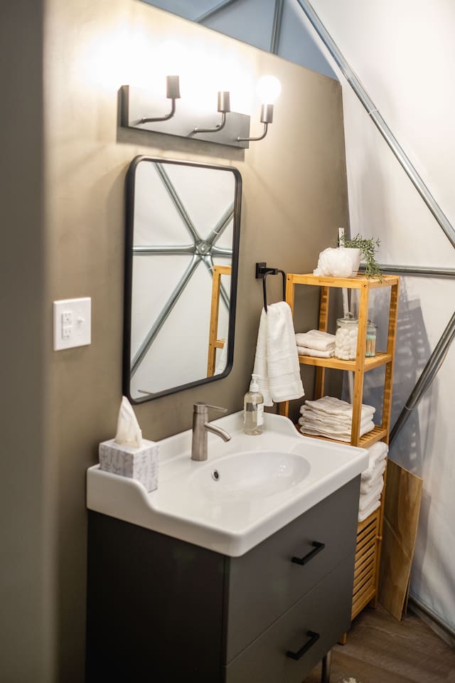 The SkyDome's primary living area features a “floating” king-sized bed. The design scheme features organic neutral tones accented by touches of greenery. Beautiful white barrel chairs placed in front of the large bay window provide a perfect place to read, meditate or simply enjoy the beautiful view. The kitchen features black leathered granite countertops, a mini fridge and freezer, coffee bar, microwave, dual hot plate, and assorted snacks. The sleek design of the restroom creates a relaxing environment to get ready for the day. Hair dryer, cotton balls and q-tips are available as well as razors, make-up wipes, shampoo, conditioner, and lotion. The outdoor seating area with a propane fire pit offers a great place to sit and have coffee in the morning or s’mores at night. And a propane grill is available for those itching to grill out. Through the back door you will walk down a rock path to the most unique feature --- the incredible outdoor shower surrounded by bamboo. And a dip in the ModTub hot tub will take the chill off any cool night! Because it is located near Lake Texoma, Lake Kiowa, and Lake Ray Roberts, the SkyDome Hideaway is the perfect place to stay and play! You can shop the cute downtowns of Whitesboro and Gainesville, or take a tour of nearby wineries. You will also be within driving distance of Megastar, Winstar, and Choctaw Casinos. So, come experience the first and only dome in the DFW/North Texas area only an hour north of the metroplex. See you soon!