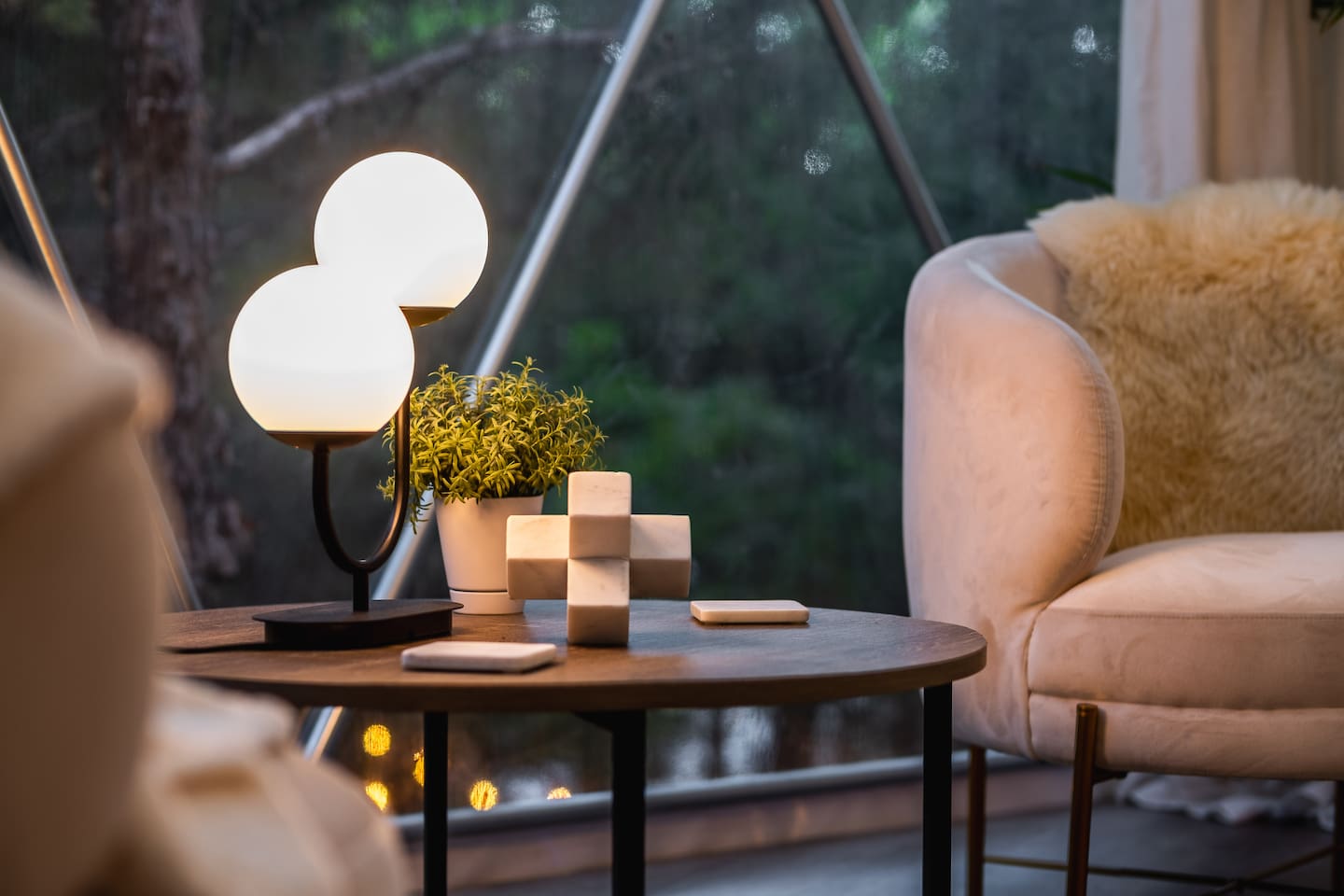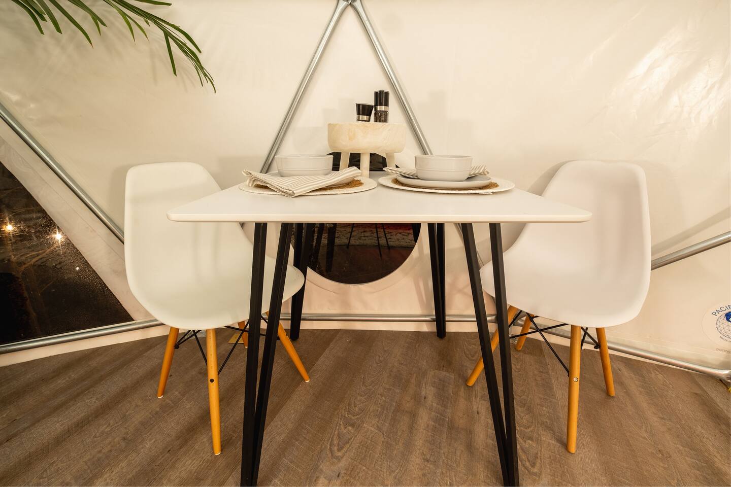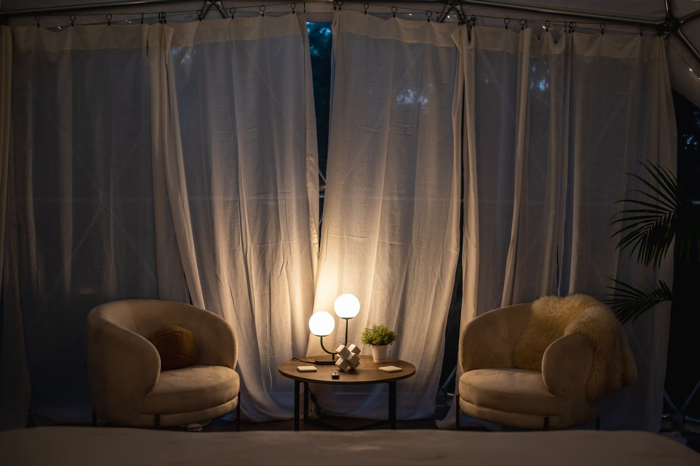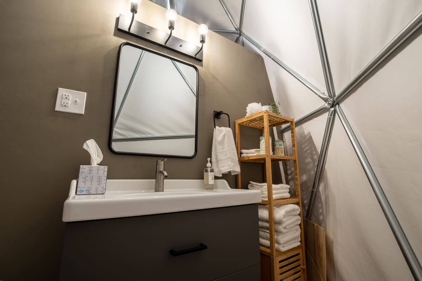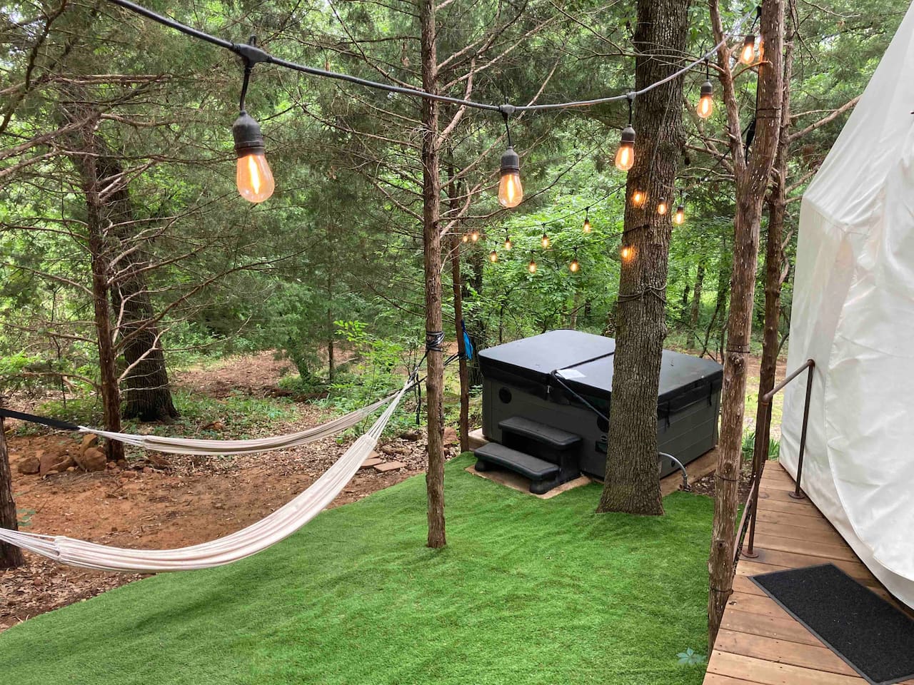 The SkyDome's primary living area features a “floating” king-sized bed. The design scheme features organic neutral tones accented by touches of greenery. Beautiful white barrel chairs placed in front of the large bay window provide a perfect place to read, meditate or simply enjoy the beautiful view. The kitchen features black leathered granite countertops, a mini fridge and freezer, coffee bar, microwave, dual hot plate, and assorted snacks. The sleek design of the restroom creates a relaxing environment to get ready for the day. Hair dryer, cotton balls and q-tips are available as well as razors, make-up wipes, shampoo, conditioner, and lotion. The outdoor seating area with a propane fire pit offers a great place to sit and have coffee in the morning or s’mores at night. And a propane grill is available for those itching to grill out. Through the back door you will walk down a rock path to the most unique feature --- the incredible outdoor shower surrounded by bamboo. And a dip in the ModTub hot tub will take the chill off any cool night! Because it is located near Lake Texoma, Lake Kiowa, and Lake Ray Roberts, the SkyDome Hideaway is the perfect place to stay and play! You can shop the cute downtowns of Whitesboro and Gainesville, or take a tour of nearby wineries. You will also be within driving distance of Megastar, Winstar, and Choctaw Casinos. So, come experience the first and only dome in the DFW/North Texas area only an hour north of the metroplex. See you soon!