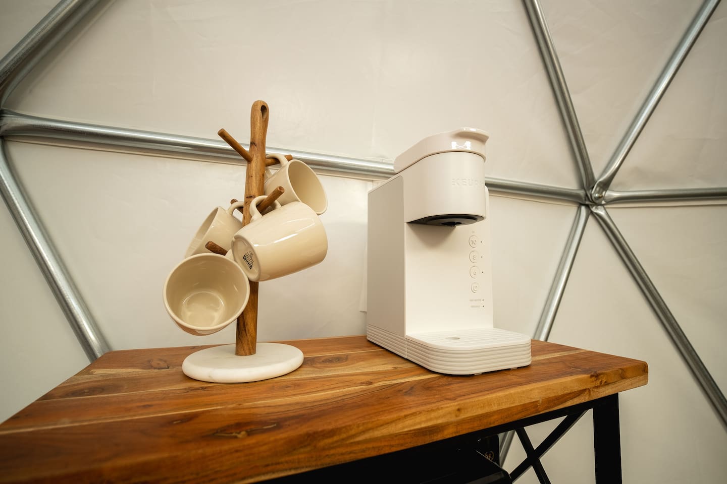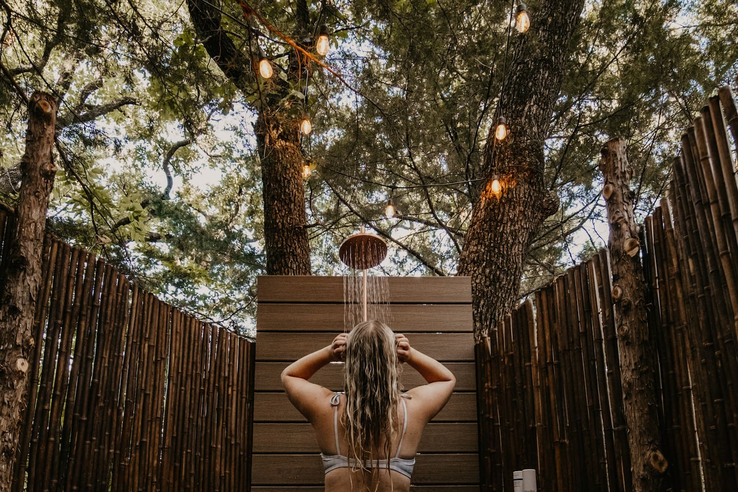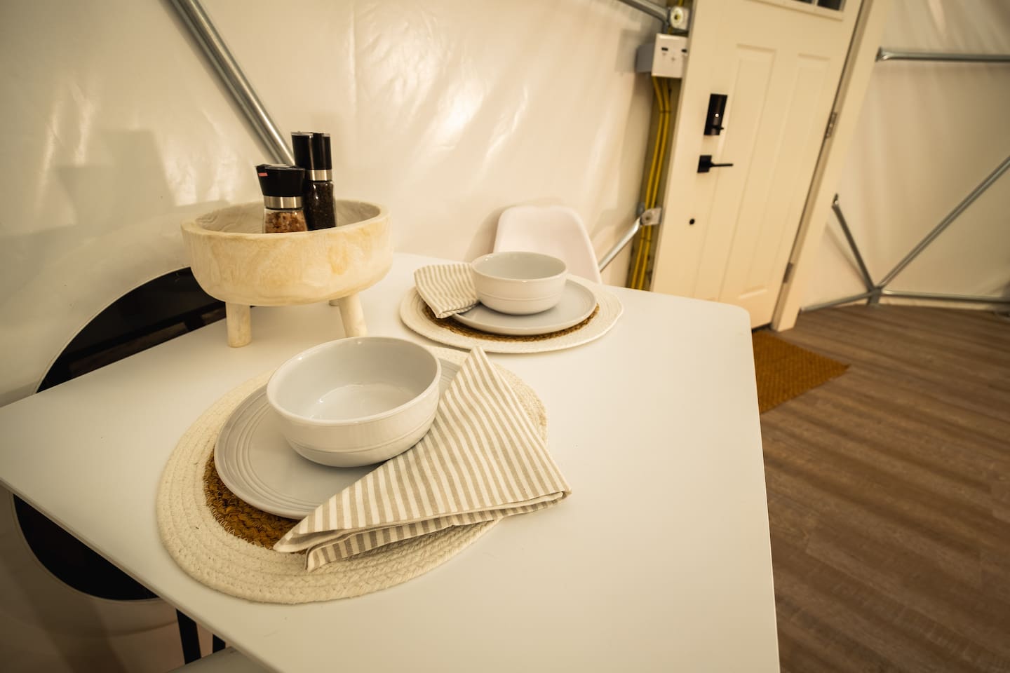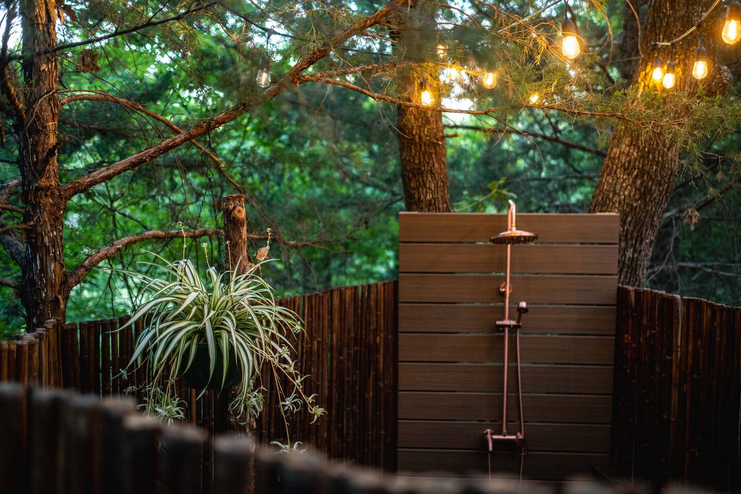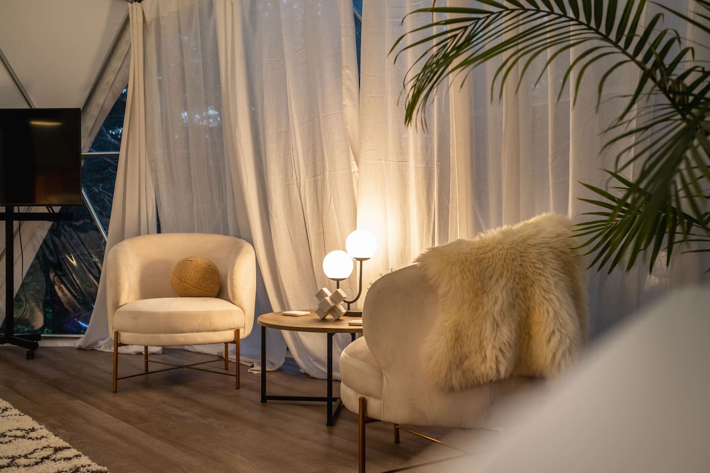 The SkyDome's primary living area features a “floating” king-sized bed. The design scheme features organic neutral tones accented by touches of greenery. Beautiful white barrel chairs placed in front of the large bay window provide a perfect place to read, meditate or simply enjoy the beautiful view. The kitchen features black leathered granite countertops, a mini fridge and freezer, coffee bar, microwave, dual hot plate, and assorted snacks. The sleek design of the restroom creates a relaxing environment to get ready for the day. Hair dryer, cotton balls and q-tips are available as well as razors, make-up wipes, shampoo, conditioner, and lotion. The outdoor seating area with a propane fire pit offers a great place to sit and have coffee in the morning or s’mores at night. And a propane grill is available for those itching to grill out. Through the back door you will walk down a rock path to the most unique feature --- the incredible outdoor shower surrounded by bamboo. And a dip in the ModTub hot tub will take the chill off any cool night! Because it is located near Lake Texoma, Lake Kiowa, and Lake Ray Roberts, the SkyDome Hideaway is the perfect place to stay and play! You can shop the cute downtowns of Whitesboro and Gainesville, or take a tour of nearby wineries. You will also be within driving distance of Megastar, Winstar, and Choctaw Casinos. So, come experience the first and only dome in the DFW/North Texas area only an hour north of the metroplex. See you soon!