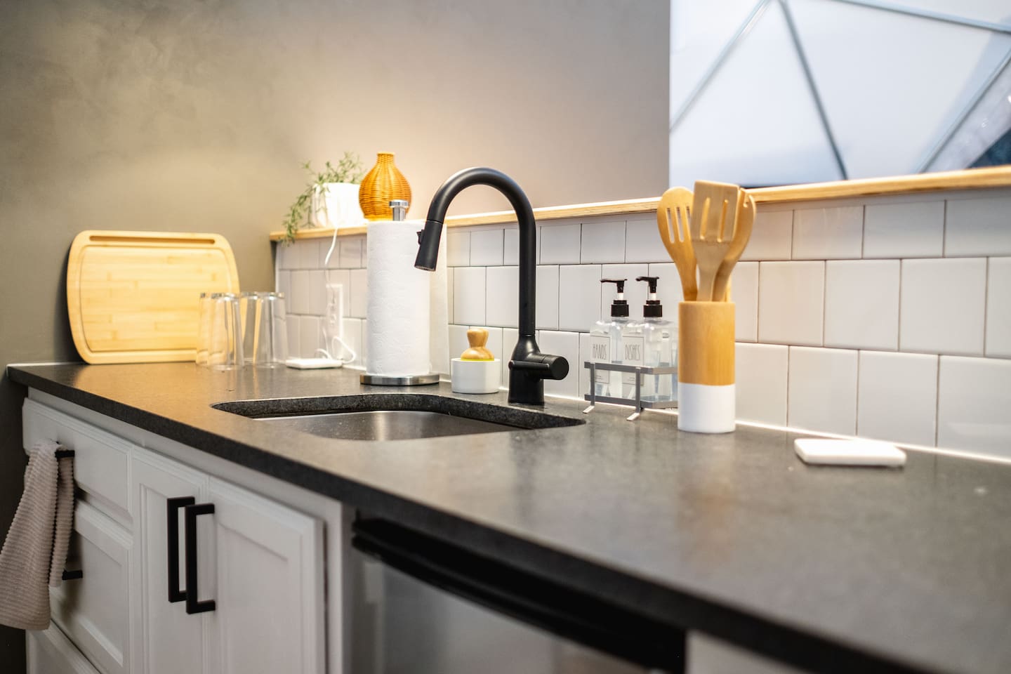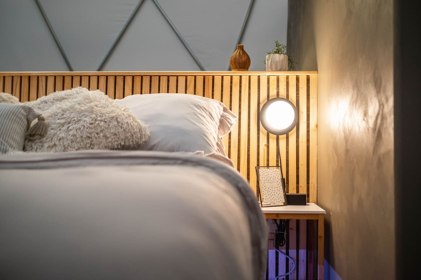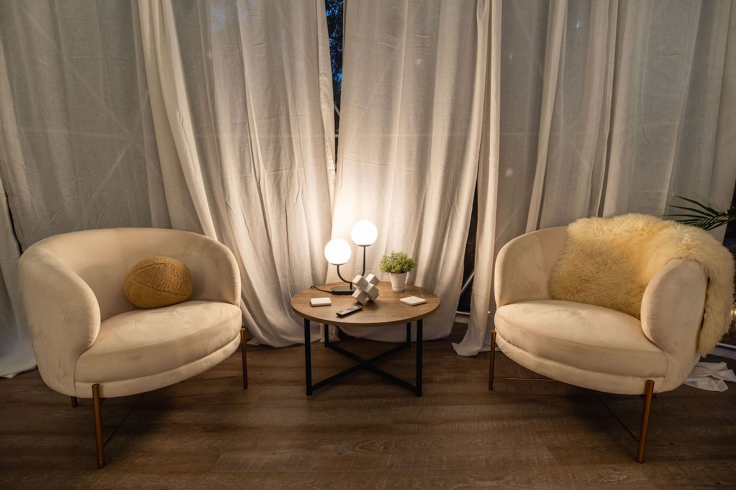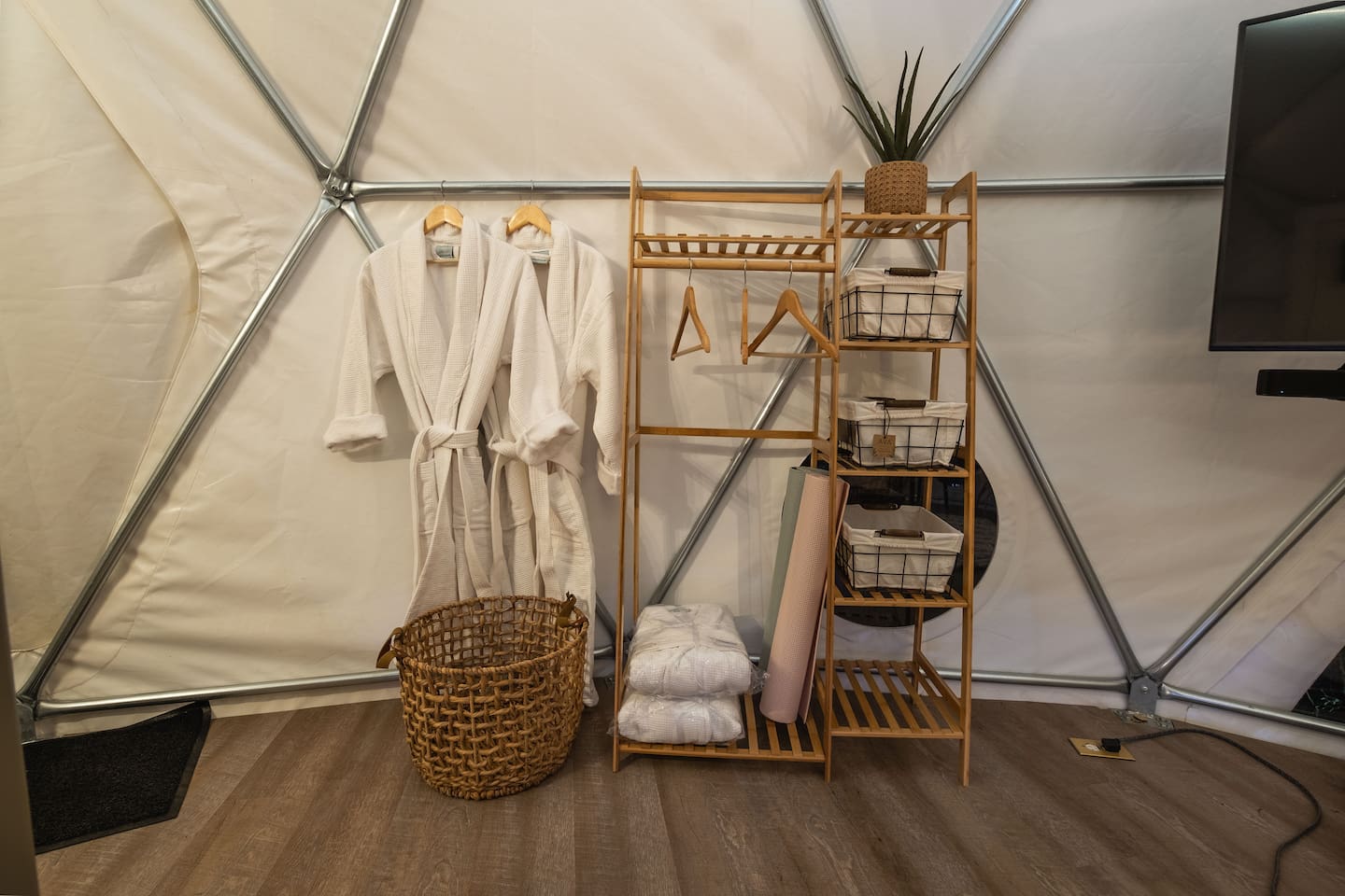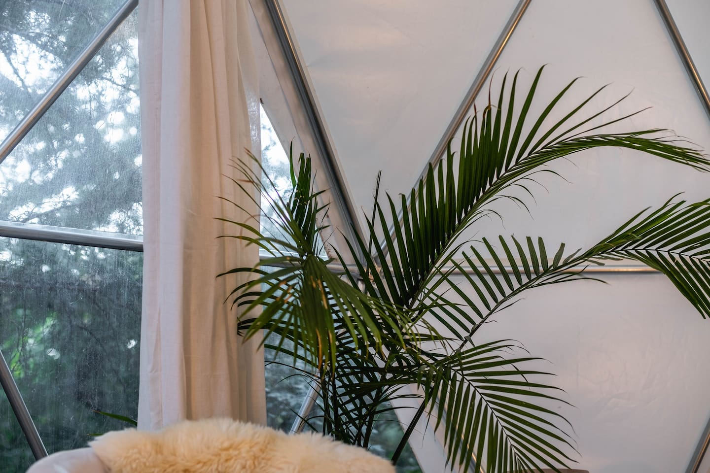 The SkyDome's primary living area features a “floating” king-sized bed. The design scheme features organic neutral tones accented by touches of greenery. Beautiful white barrel chairs placed in front of the large bay window provide a perfect place to read, meditate or simply enjoy the beautiful view. The kitchen features black leathered granite countertops, a mini fridge and freezer, coffee bar, microwave, dual hot plate, and assorted snacks. The sleek design of the restroom creates a relaxing environment to get ready for the day. Hair dryer, cotton balls and q-tips are available as well as razors, make-up wipes, shampoo, conditioner, and lotion. The outdoor seating area with a propane fire pit offers a great place to sit and have coffee in the morning or s’mores at night. And a propane grill is available for those itching to grill out. Through the back door you will walk down a rock path to the most unique feature --- the incredible outdoor shower surrounded by bamboo. And a dip in the ModTub hot tub will take the chill off any cool night! Because it is located near Lake Texoma, Lake Kiowa, and Lake Ray Roberts, the SkyDome Hideaway is the perfect place to stay and play! You can shop the cute downtowns of Whitesboro and Gainesville, or take a tour of nearby wineries. You will also be within driving distance of Megastar, Winstar, and Choctaw Casinos. So, come experience the first and only dome in the DFW/North Texas area only an hour north of the metroplex. See you soon!